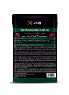 Η Savory Pouch για ενήλικες γάτες προσφέρει πλήρη υγρή διατροφή υψηλής ποιότητας με κομμάτια αρνιού και παντζάρι σε νόστιμη σάλτσα.