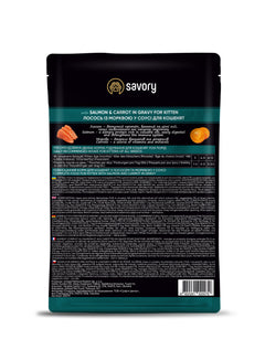 Πλήρης υγρή τροφή για γατάκια έως 1 έτους, με κομμάτια σολομού και καρότου σε σάλτσα.