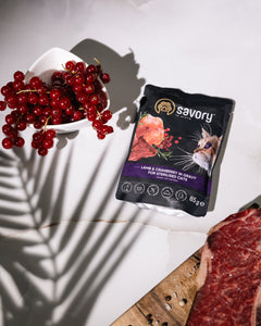 Η υγρή τροφή «Savory Pouch Sterilized με Αρνί και Κράμπερι» έχει σχεδιαστεί ειδικά για στειρωμένες και στείρους γάτους, προσφέροντας πλήρη και ισορροπημένη διατροφή.